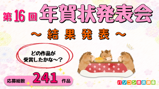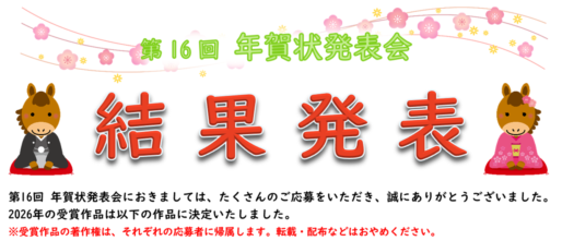 年賀状発表会第16回 年賀状発表会(教室賞) 教室賞 賞品 QUOカード5百円 西新教室 玉ちゃんさま インストラクターのコメント 生徒様のコメント 飯倉教室 みかんさま インストラクターのコメント 生徒様のコメント 大橋教室 R.Tさま インストラクターのコメント 生徒様のコ... 2026.02.20年賀状発表会