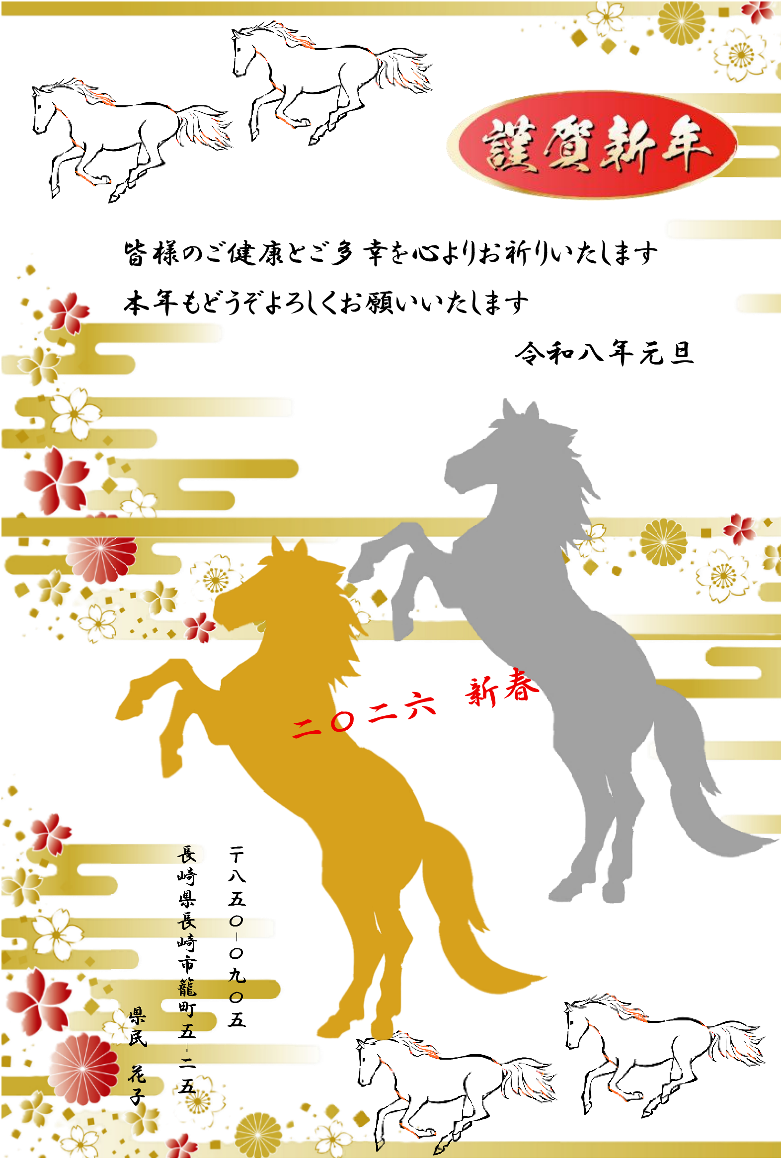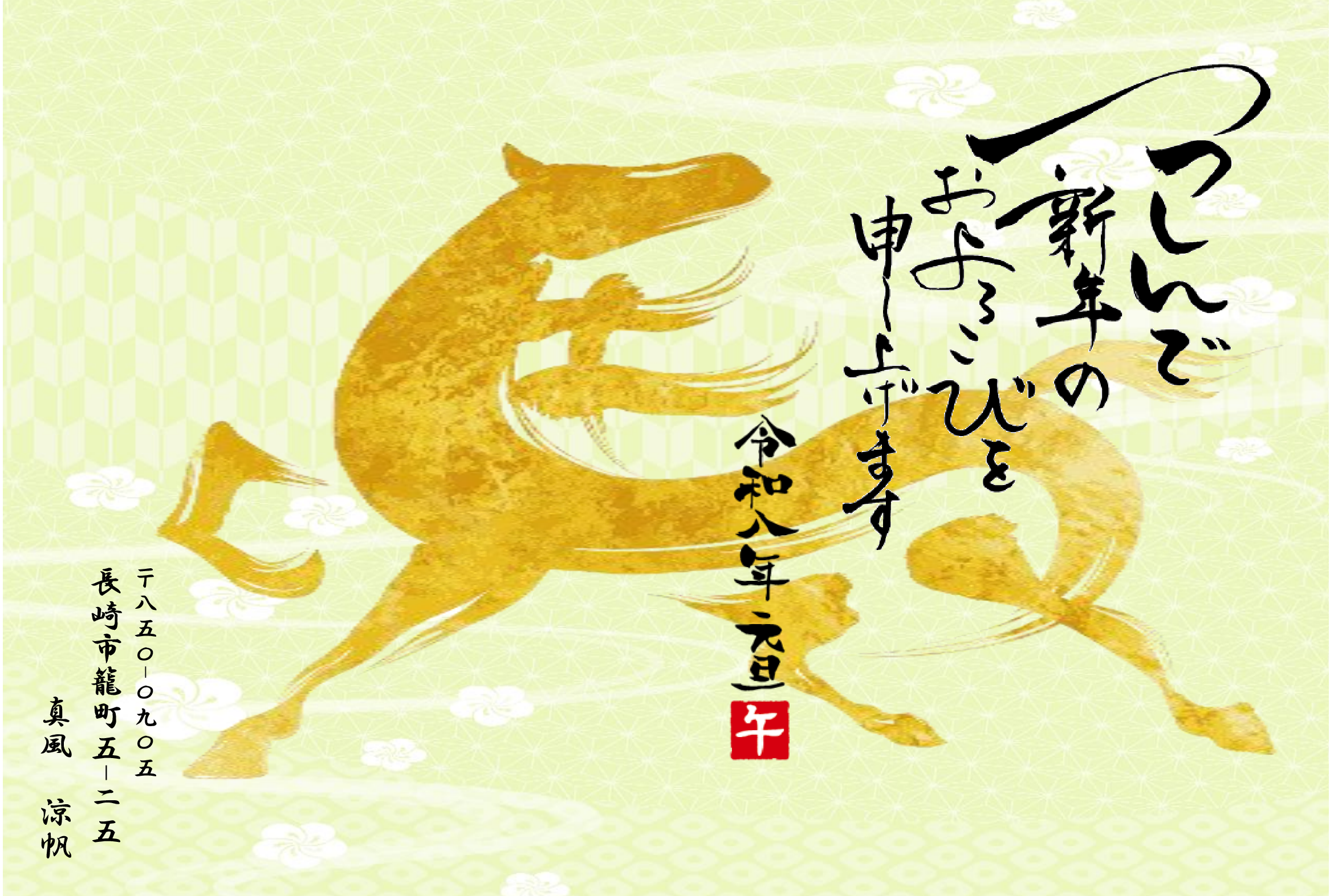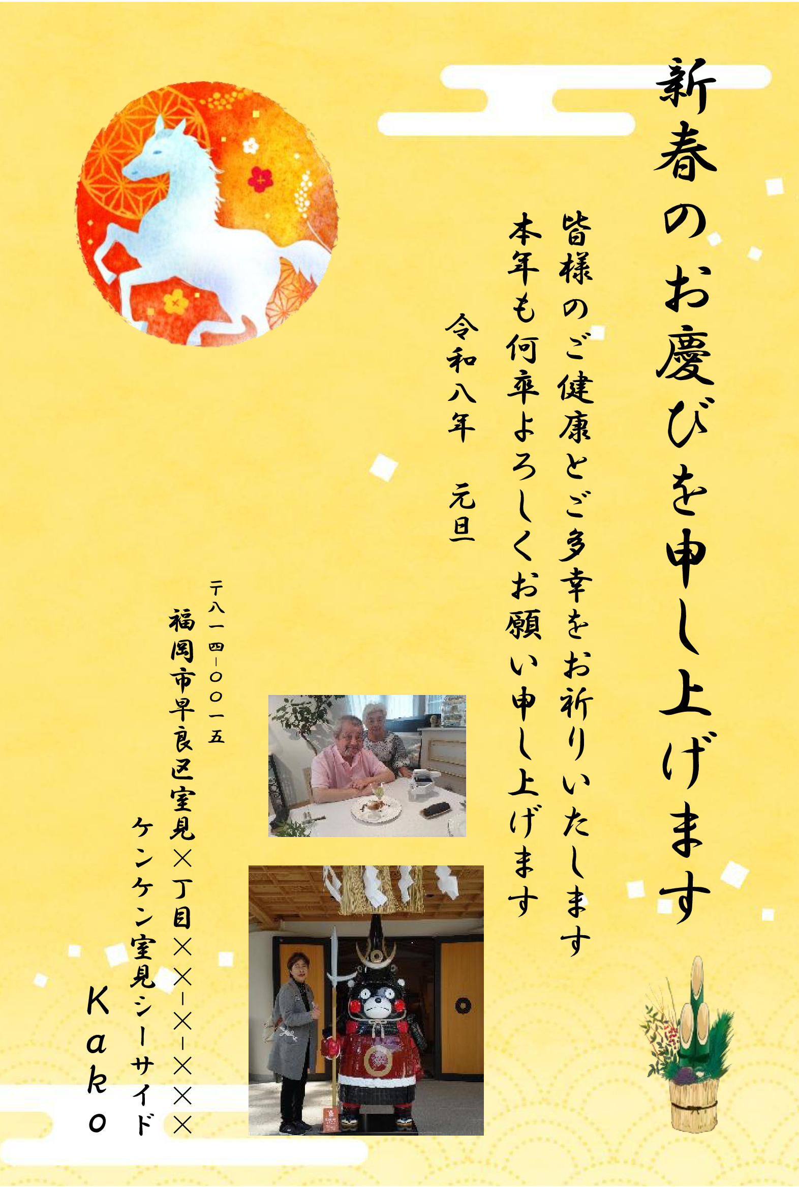 郵便年賀のサイトから画像を選んでアレンジしました。ナンテンの実、馬の姿がお気に入りです。外枠に大好きな黄色を加えました。