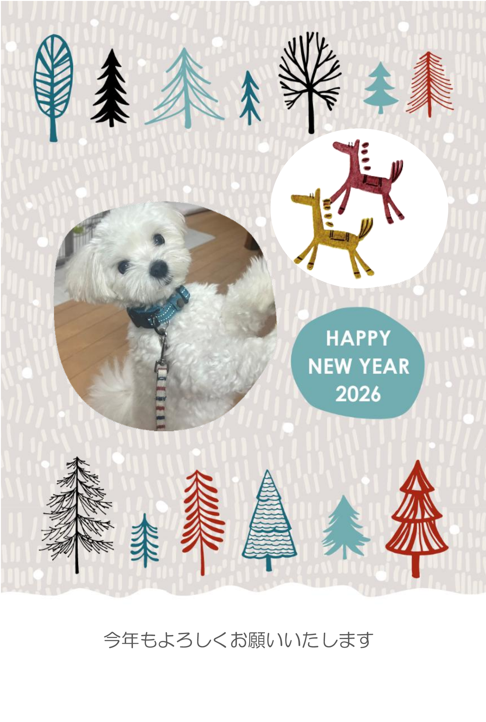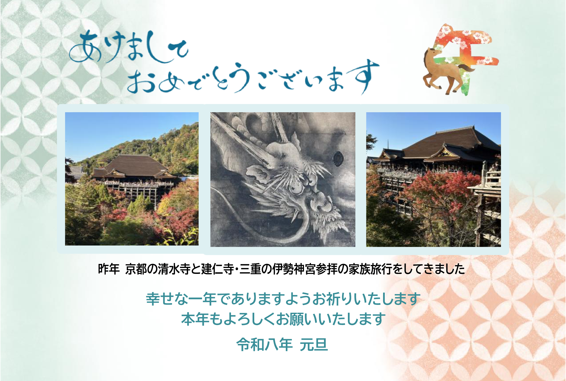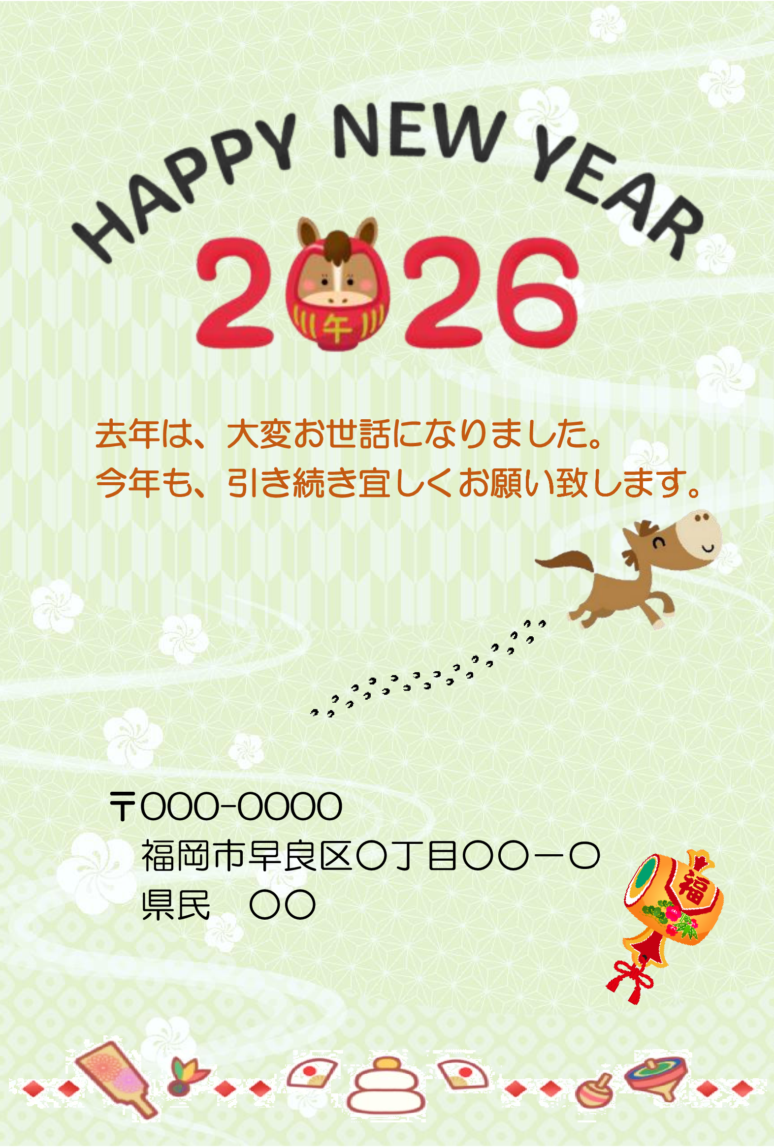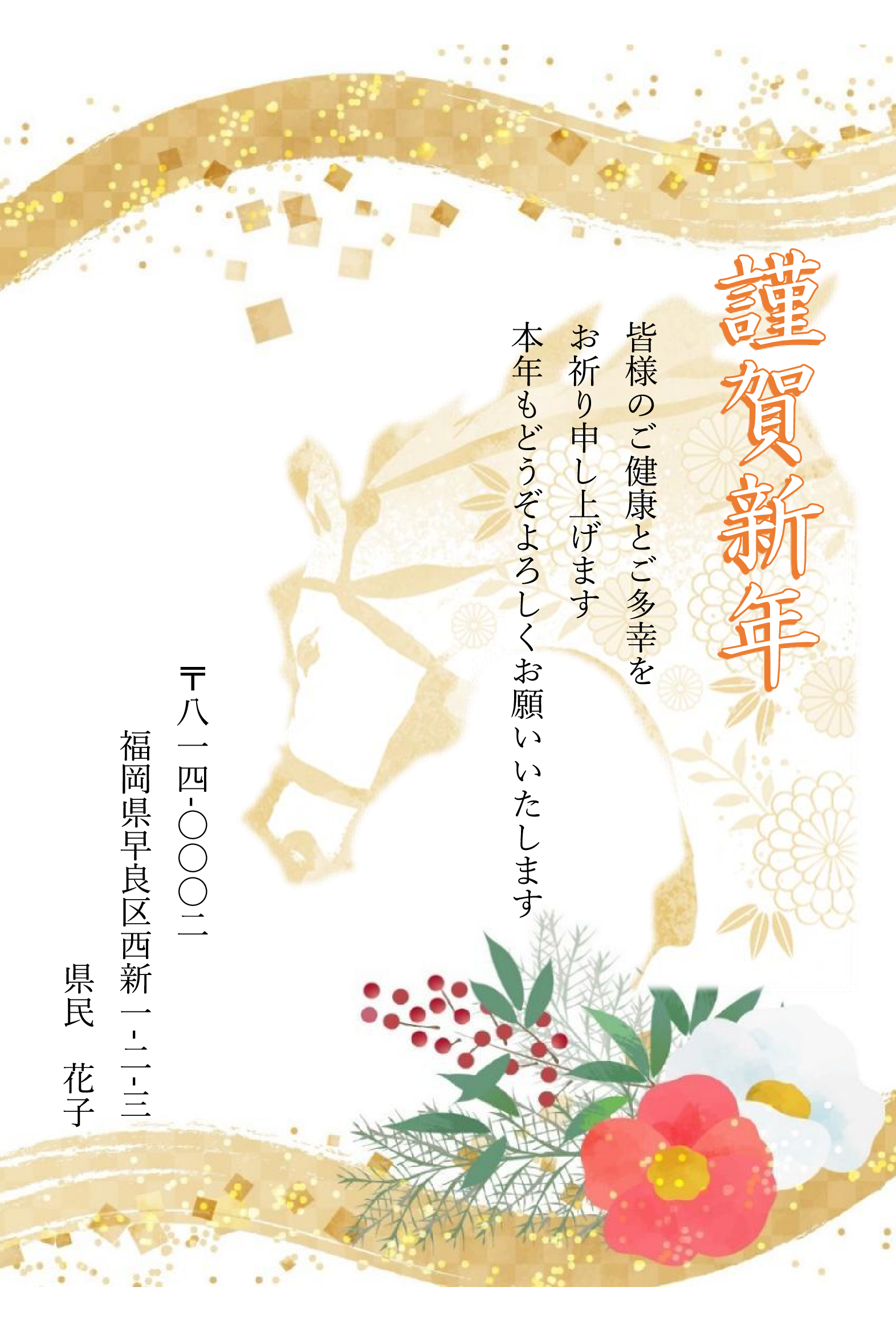 郵便年賀のサイトから画像を選んでアレンジしました。ナンテンの実、馬の姿がお気に入りです。外枠に大好きな黄色を加えました。