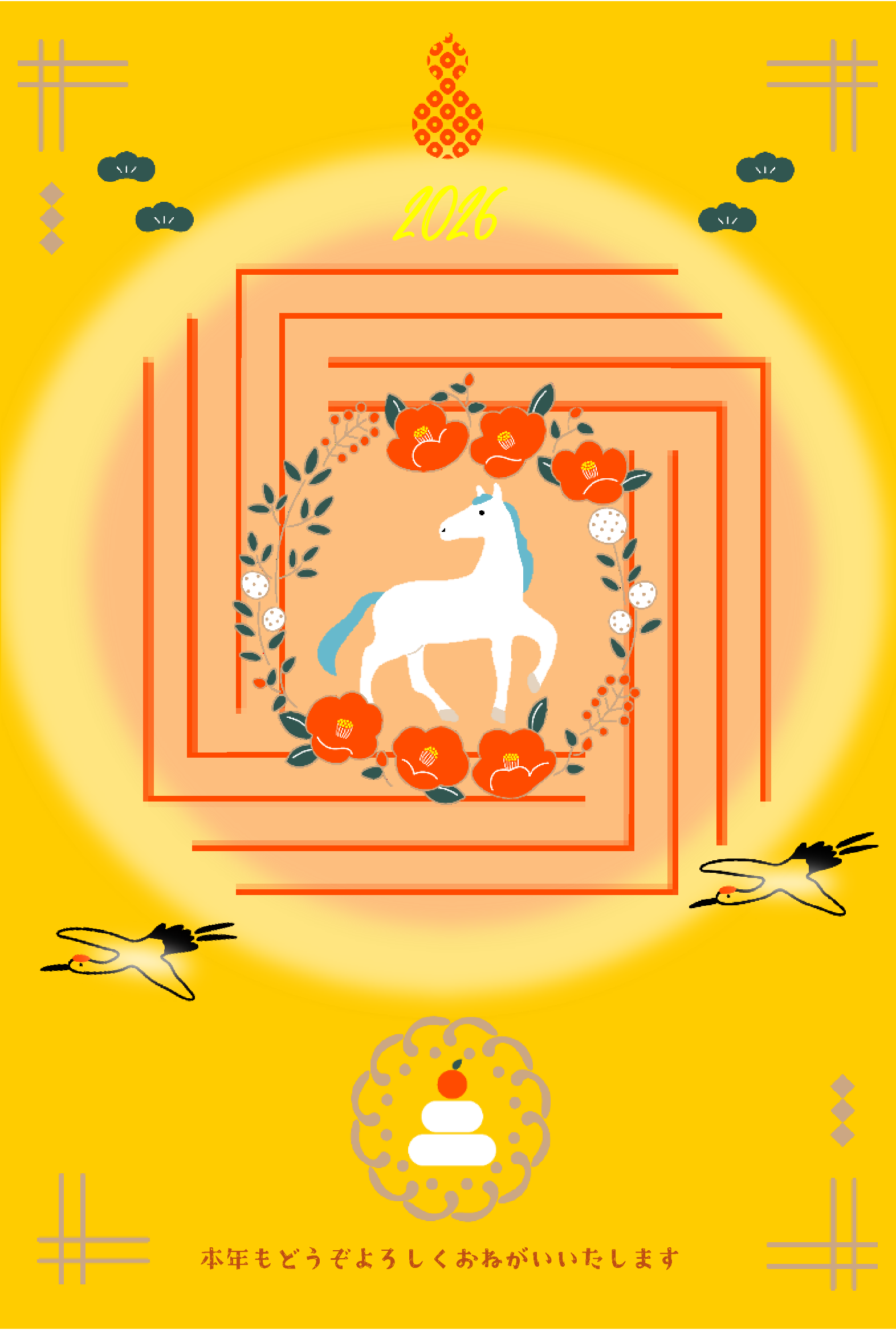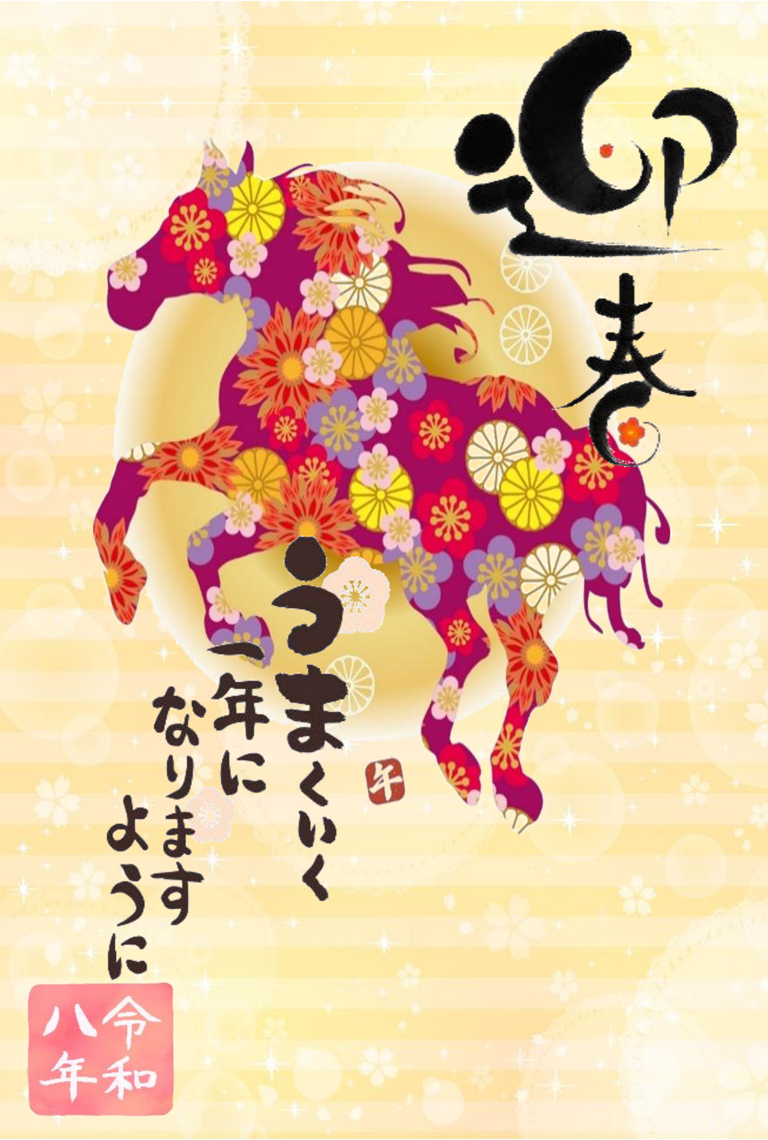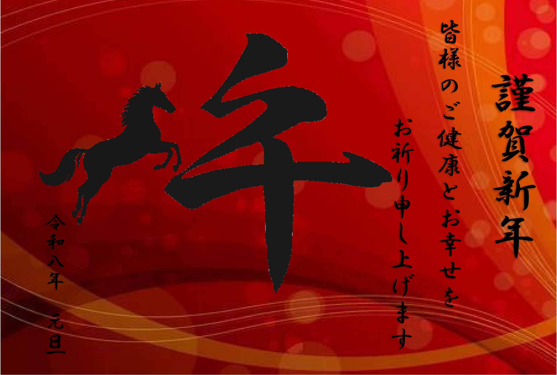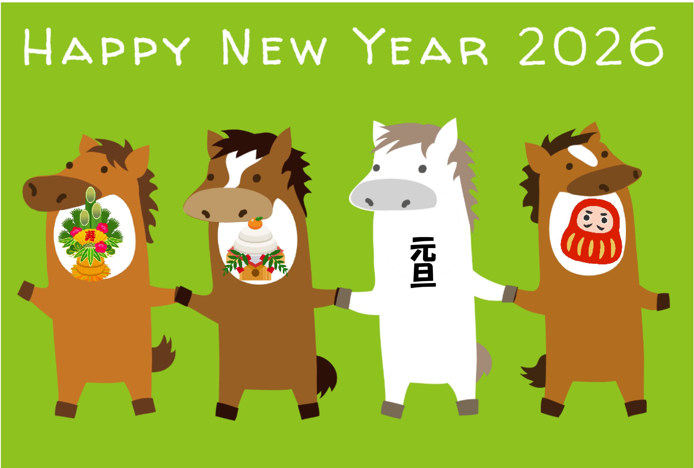 毎年恒例の赤背景に干支文字を入れ、今年は馬の絵を足してみました。