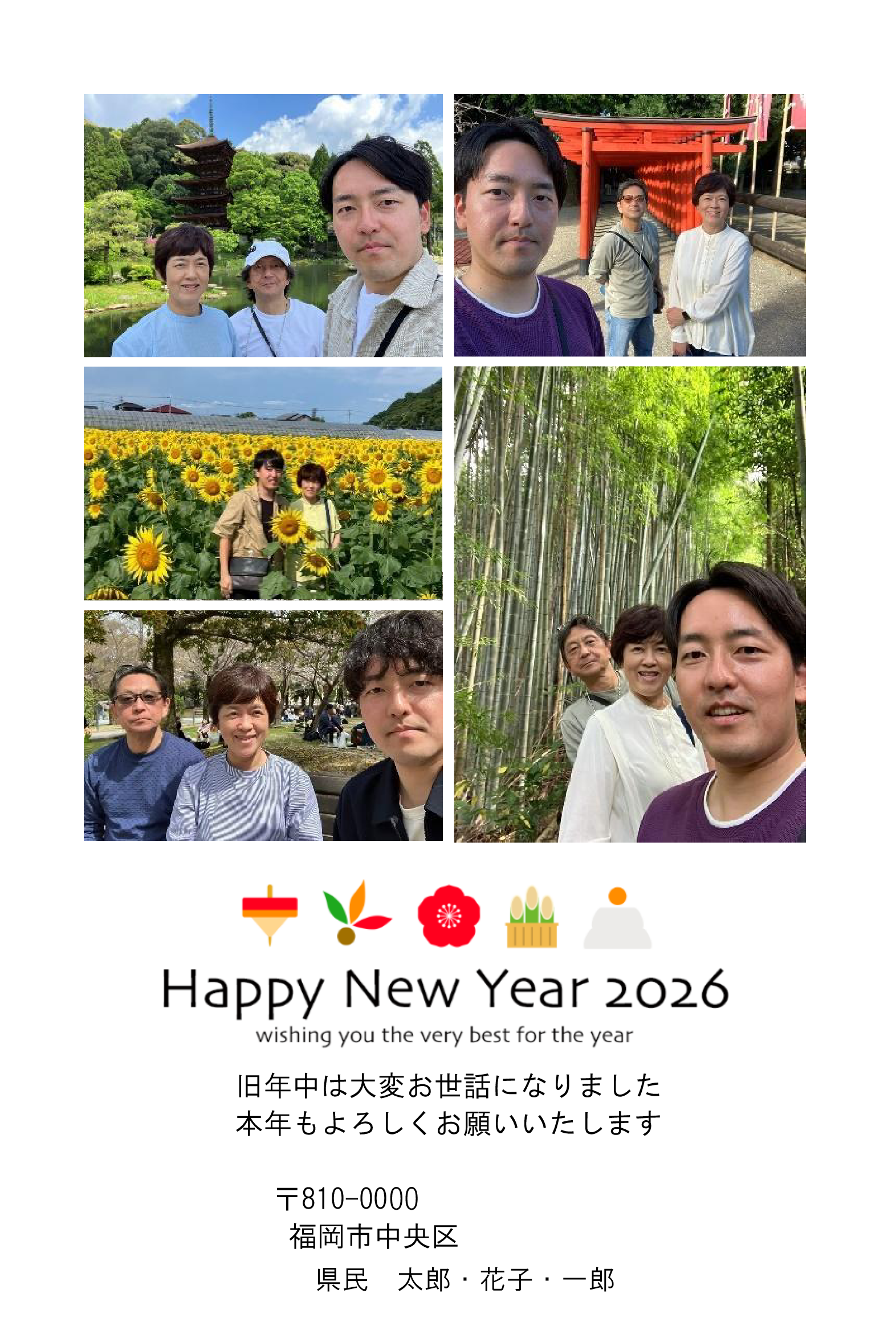 新しい年!!今まで家族写真でしたが、あまりに孫の数が多くなり、断念しました。今年のデザインは先生方のご指導で何とかできました。